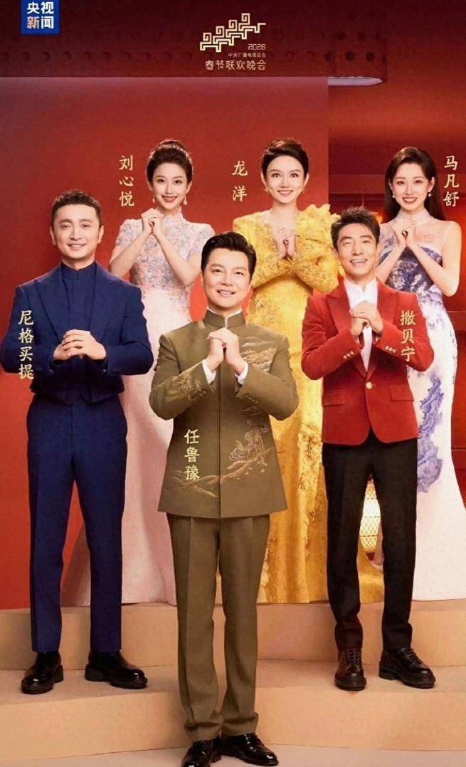 今年的站位也很直观:任鲁豫稳居中间C位,龙洋在身后C位托住女主持的主力线,撒贝宁与尼格买提分立两侧,颜色对比鲜明,视觉上就有“红蓝”年味
